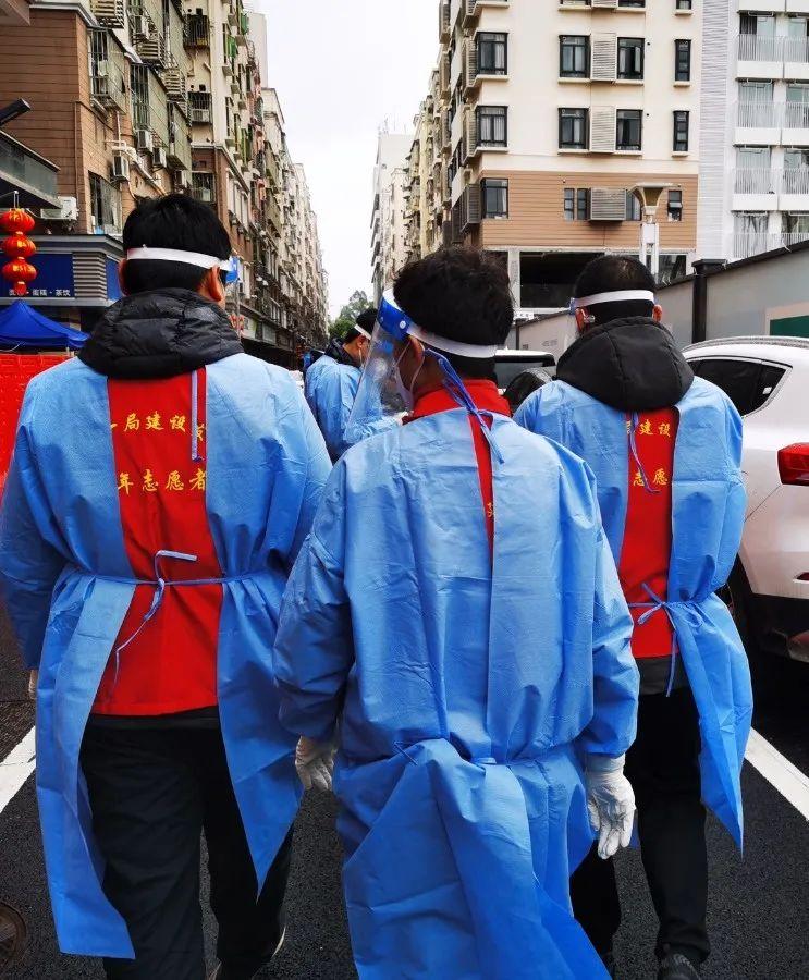 当天下午抵达社区后,志愿者们纷纷换上了防护服,臂膀上“青春福田”的标志让他们更为自己的志愿者身份感到自豪。正如标志所言,他们青春而富有满满的元气,他们的加入为社区带来不少朝气。