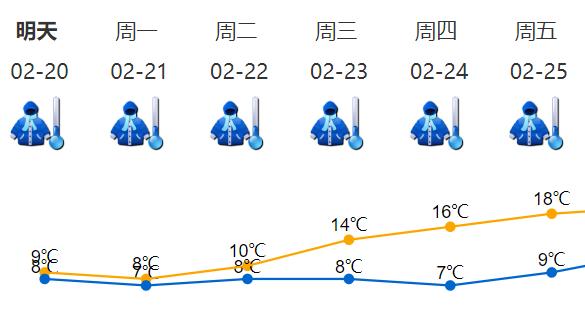 预计20日阴天,有中雨局部大雨,气温8-9℃,沿海高地阵风7-8级;21日有中到大雨,局部暴雨,22日有中雨局部大雨,期间最低气温降至7℃左右,日温差小,体感非常寒冷;