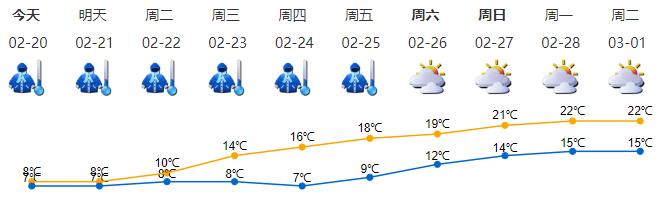 ●2月20日,阴天有中雨,局部大雨,天气阴冷,气温7~8℃;2月21—22日低温阴雨持续,有中到大雨,最低气温7℃左右,日温差小,体感非常寒冷;2月23日白天降雨趋于结束,转多云天气;2月24—25日多云到晴天,早晚寒冷,昼夜温差加大,白天气温回升。冷空气影响期间沿海、高地和海区最大阵风可达7~9级。