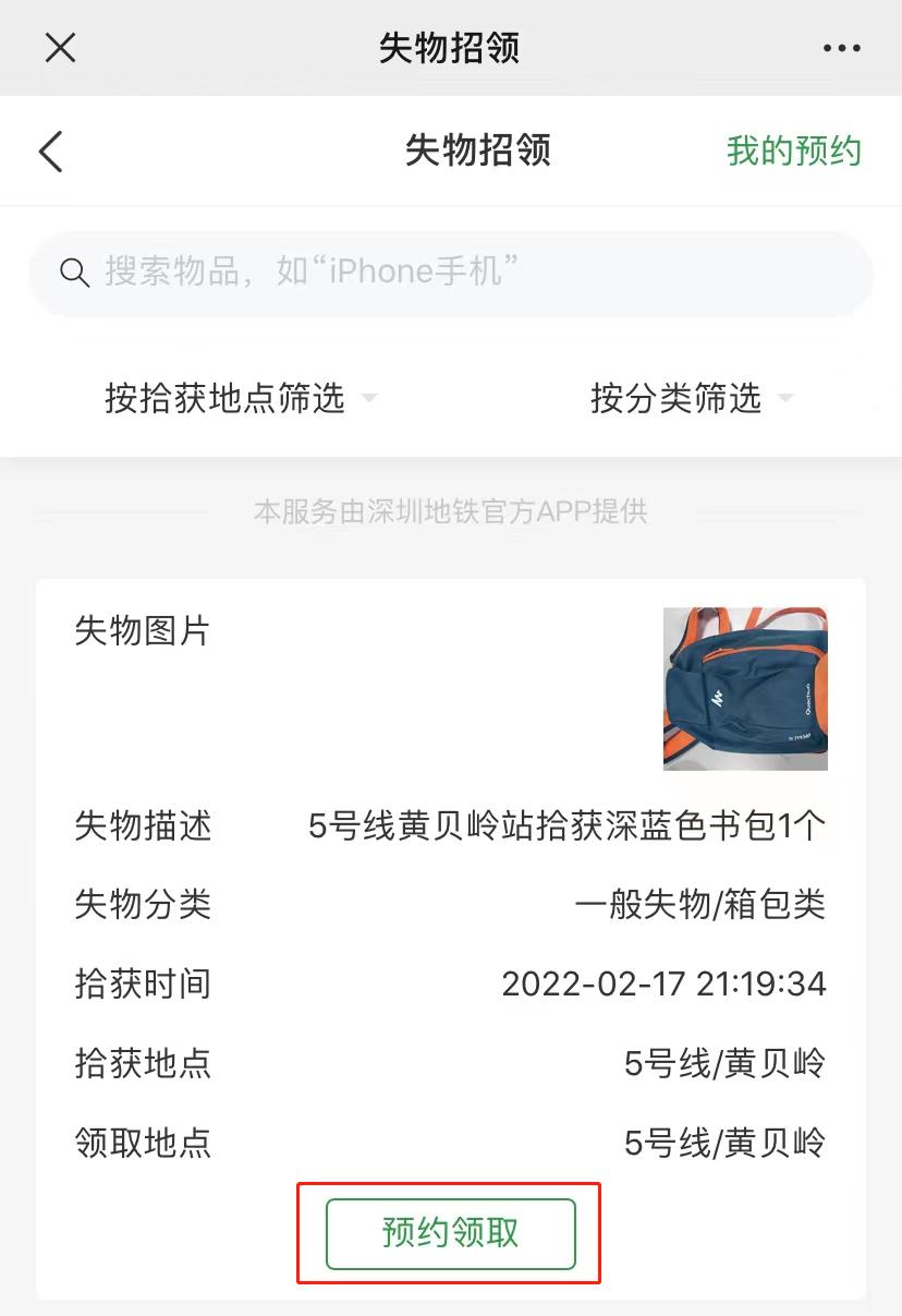 如找到丢失的物品点击【预约领取】并前往该站点领取失物