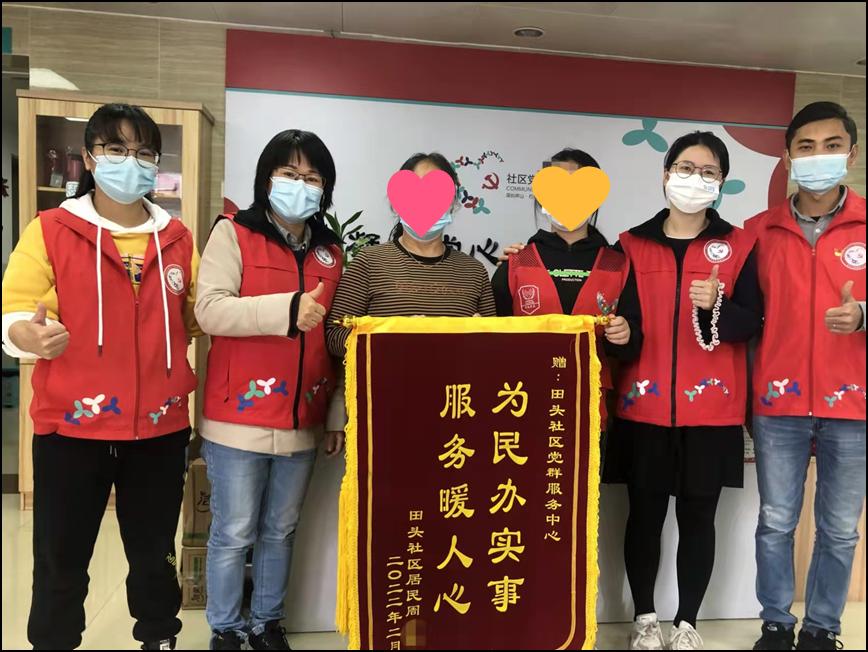 近日,石井街道田头社区党群服务中心收到社区居民周某送来的一面印有“为民办实事,服务暖人心”的锦旗,对街道、社区用心、用情、用力为其家人提供的志愿服务表示感谢。