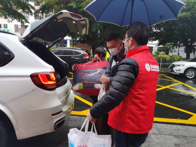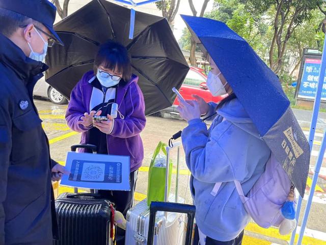 天色阴冷 ,下着小雨,多名身穿红色义工马甲的教师志愿者,在校门口为下车的学生打伞、协助搬运行李、指导扫码,帮助学生快速返校。
