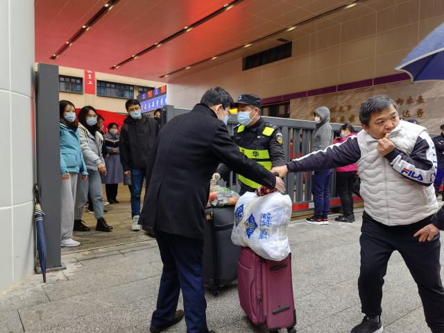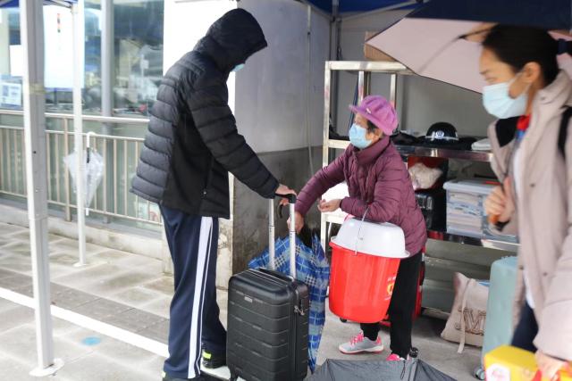 返校高峰期,教师志愿者一趟又一趟地协助学生搬运行李,雨水打在脸上都来不及擦掉。