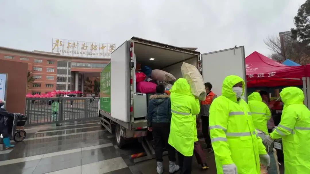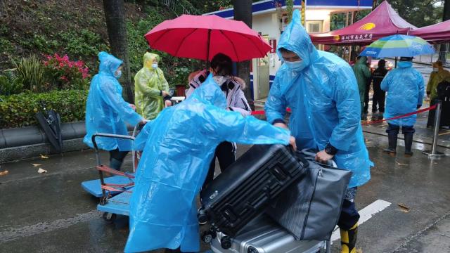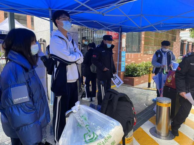 在核查完符合返校要求的学生的24小时核酸、绿码、测量体温后,老师们与学校保安队主动上前,帮学生们搬运大件行李物品。高三年级返校师生施行封闭式管理,老师、学校行政与学生们同吃、同住,共抗疫情。