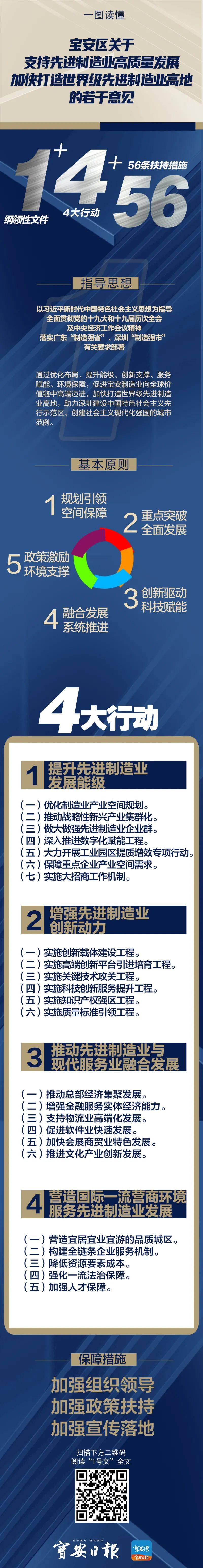 《意见》根据宝安资源禀赋和发展现状,部署了提升制造业能级、增强制造业创新动力、推动先进制造业与现代服务业融合发展、营造国际一流营商环境服务先进制造业发展4大行动,并配套实施56条扶持措施,精准服务对应的市场主体。