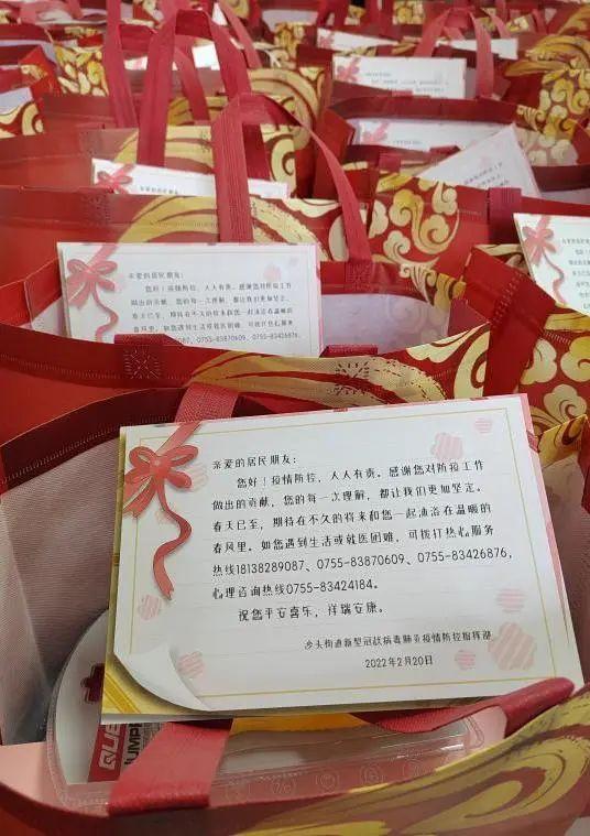 为帮助封控管理区的居民和工作人员抵御寒冷,沙头街道连夜购买近100个取暖加热器和700个暖手宝,还为封控区居民精心准备200余份爱心礼包,包括热水袋、速食食品、牛奶大礼包、跳绳等物资,并特别制作爱心卡、感谢贺卡等小卡片,送上温暖关怀。