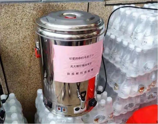 而下沙社区辖区的光大银行福田支行得知社区正在进行大规模核酸检测工作时,迅速开展“防疫慰问送温暖”活动,为核酸检测点送来一大桶红糖水。“最近天气寒冷,一线工作人员在采样现场顶着寒风大雨,坚持为居民做核酸检测,实在是太辛苦了。为抗疫尽些绵薄之力是我们的义务和责任,战胜疫情需要每个人的努力,希望这些红糖水能让大家感受到一丝温暖。”光大银行的工作人员说道。他们还叮嘱一线人员室外工作要注意身体,做好防寒保暖。