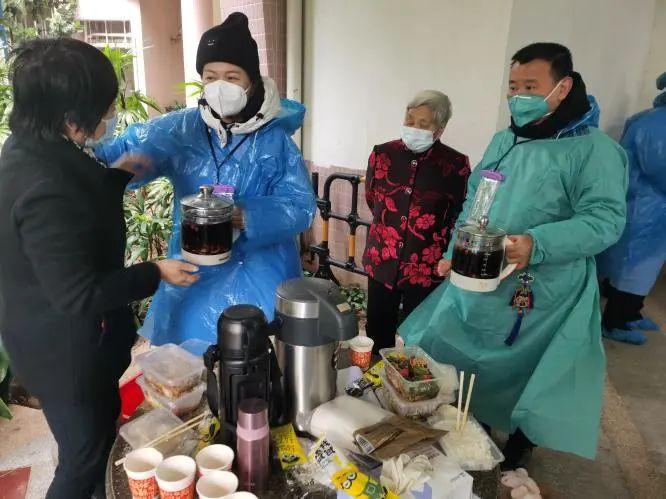 沙嘴社区居民为抗疫工作人员送来热姜茶、暖宝宝等御寒物资,一句句“辛苦了”“谢谢您”足以驱散寒冷。