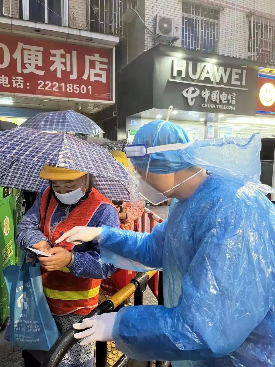 ▲背街小巷上,“防护服”“红马甲”“花雨伞”来回穿梭,为守护生命而奔走,在这个雨天里交织成动人的画面。
