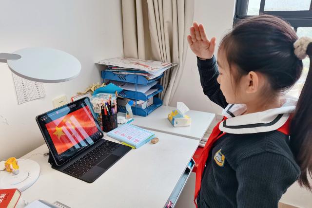 2月21日,龙岗区坂田实验学校全体师生通过网络如“约”相聚,共同参加《向春光,展新望》为主题的线上升旗活动。屏幕里,师生们身着整洁服装,立正敬礼,高唱国歌。