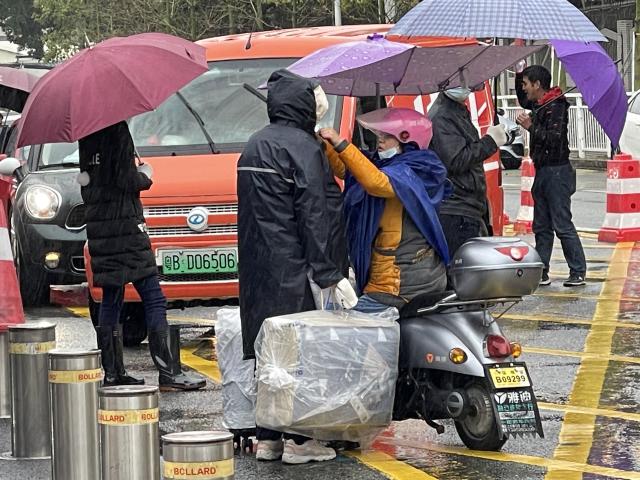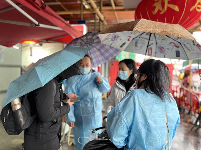 天色阴冷 ,下着小雨,多名身穿红色义工马甲的教师志愿者,在校门口为下车的学生打伞、协助搬运行李、指导扫码,帮助学生快速返校。