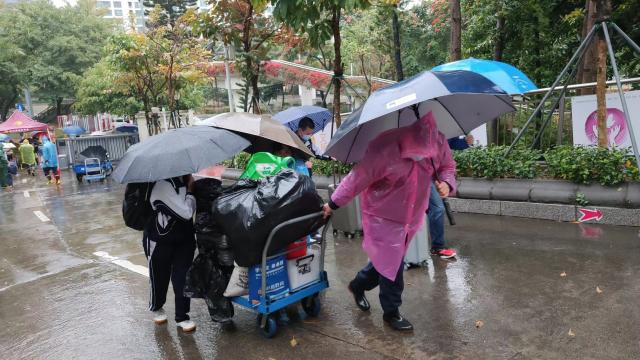 春雨不停,为方便高三学子顺利有序入校,南头中学贴心准备了小推车协助学生搬运行李。