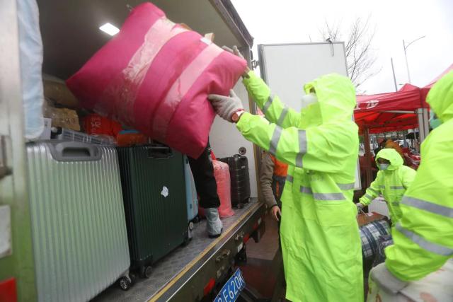 高三学生到校门口后,他们的行李统一装车,严格消毒后进入校园。