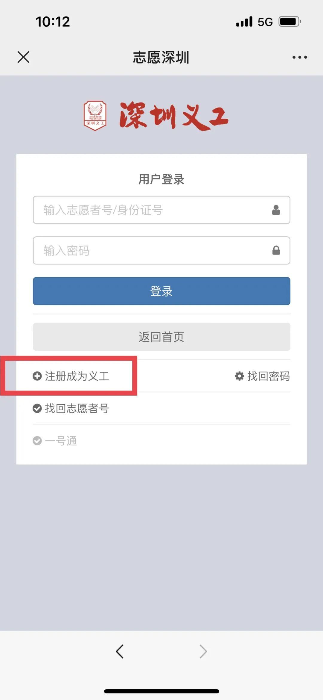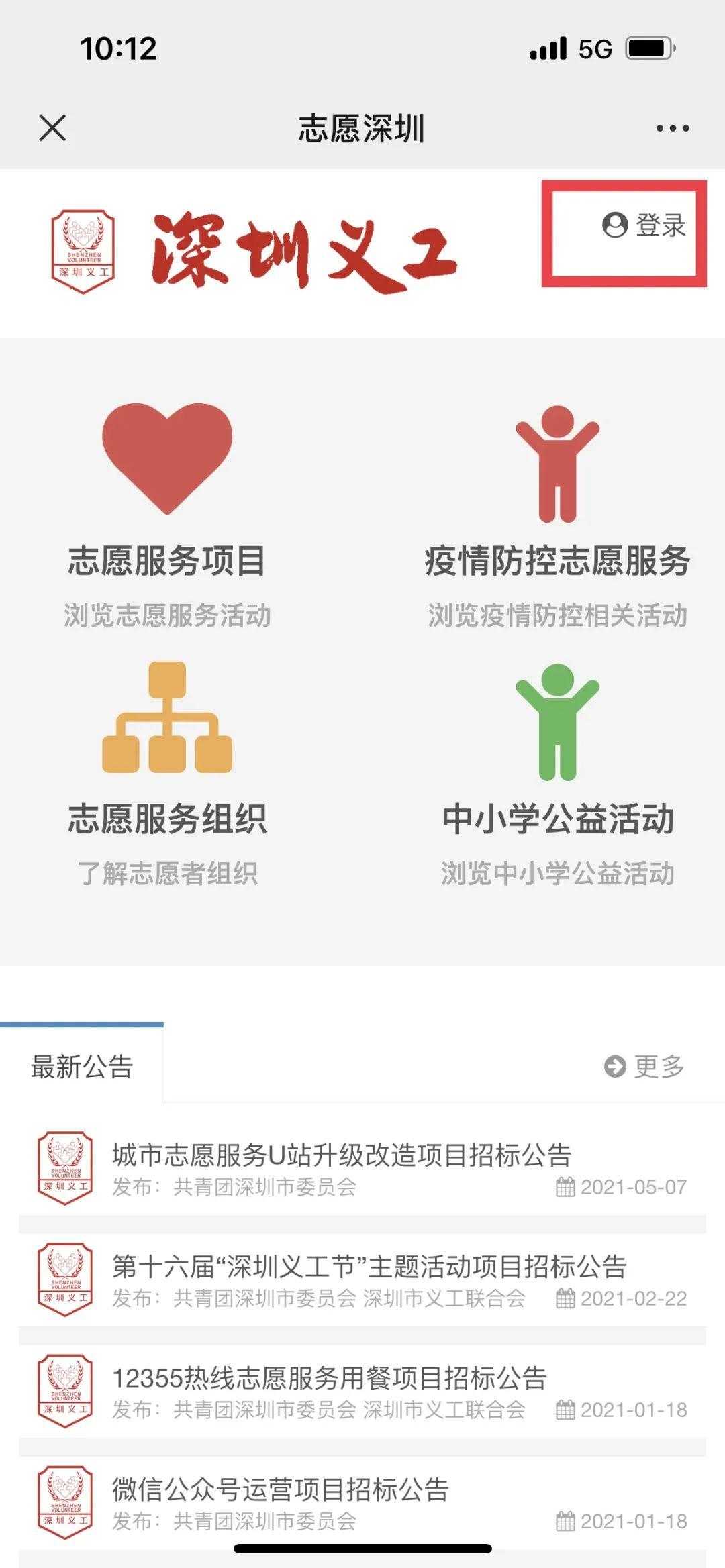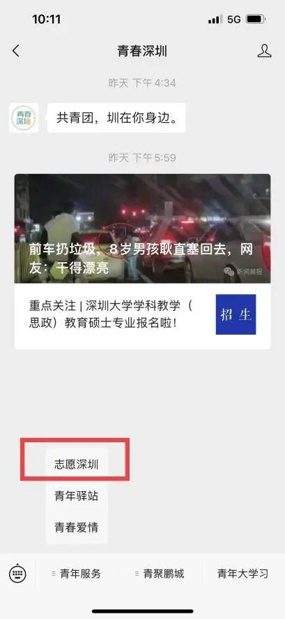 1.微信搜索“青春深圳”公众号(如下图红框内点击进行操作,志愿深圳-登录-注册成为义工)