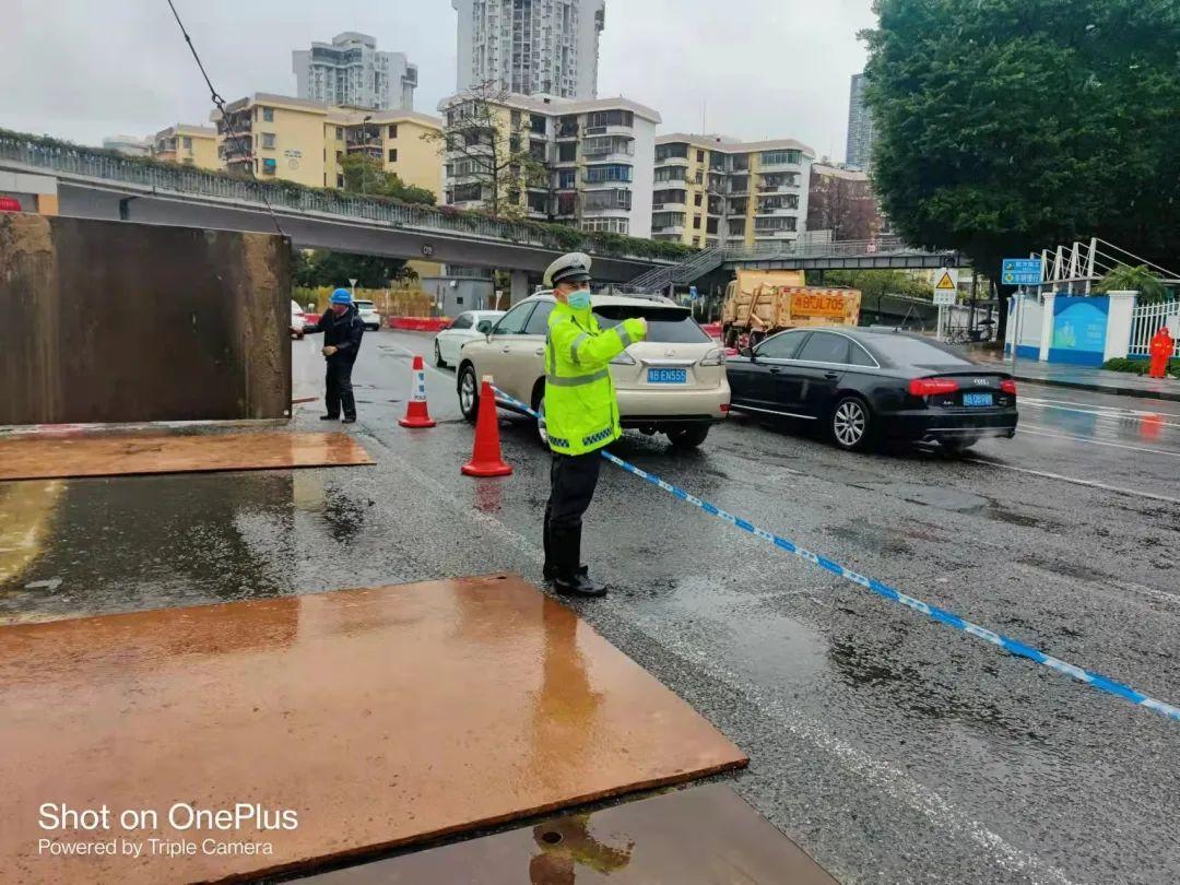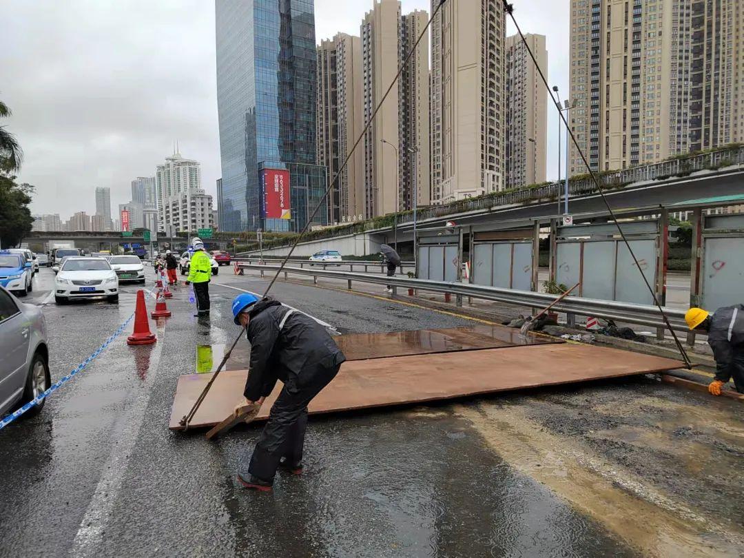 2月21日,连续多日降雨影响,导致滨河红岭立交路面坑洼不平,过往车辆纷纷被“坑”。为解决该路段坑洼影响车辆通行问题,罗湖交警冒雨与春风隧道施工方将八块大铁板平铺路面坑洼处,恢复正常路面通行。