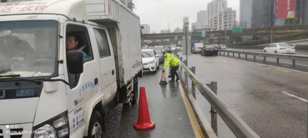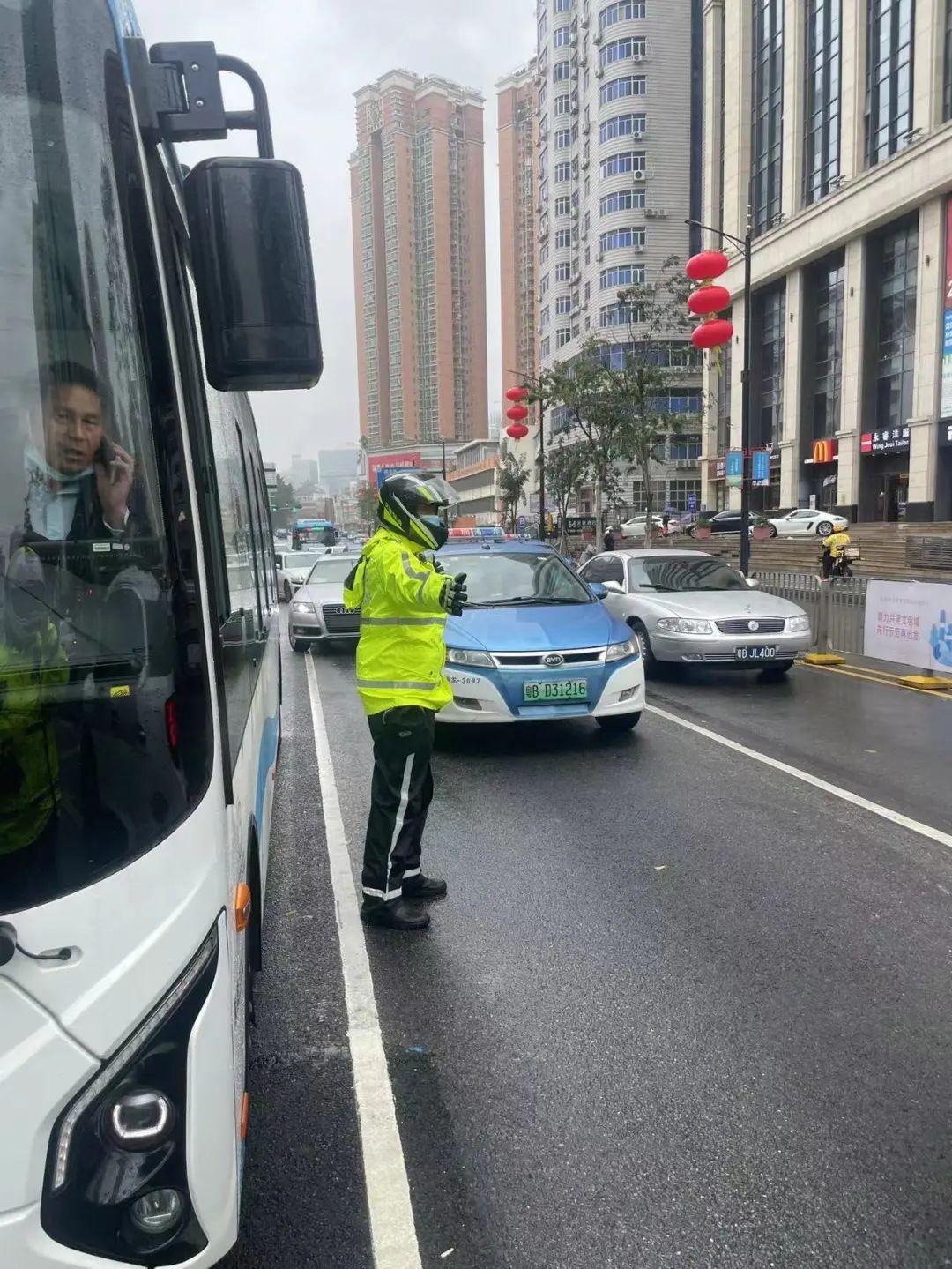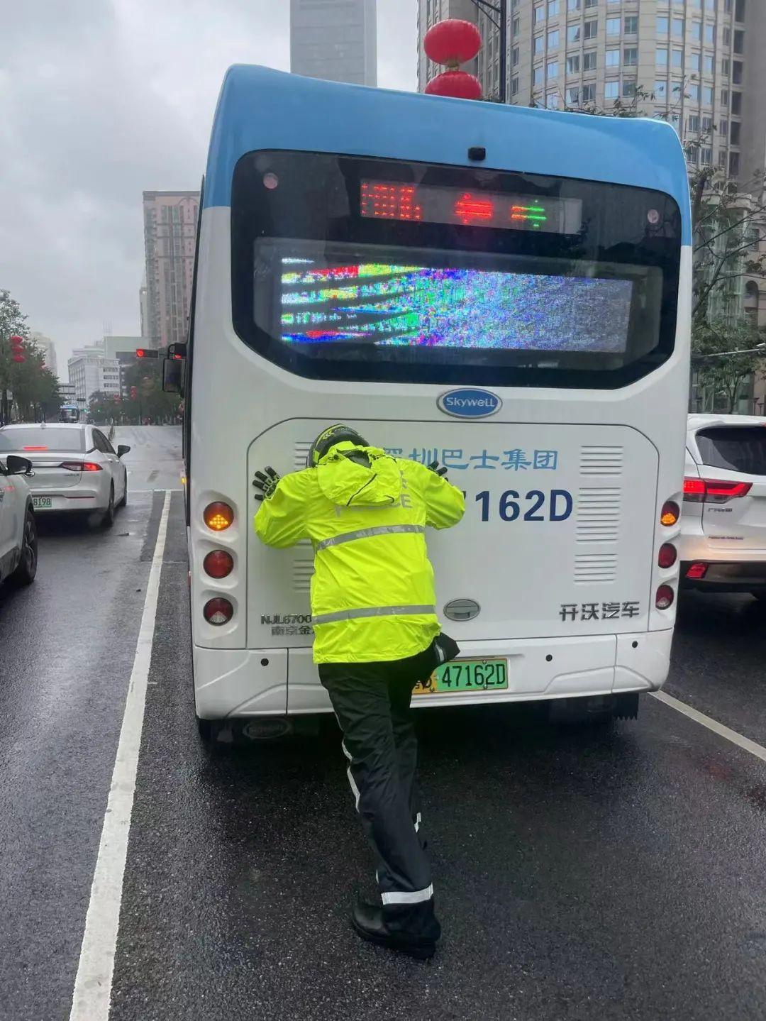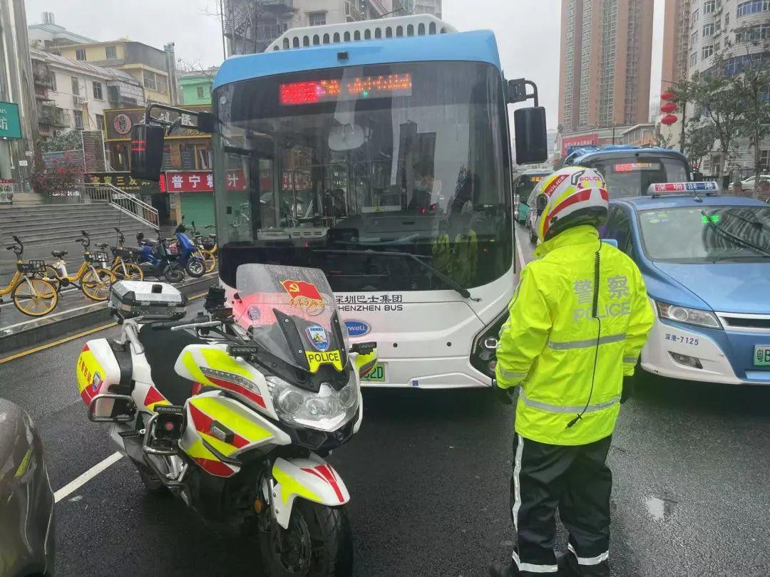 2月19日,一公交车在主干道打双闪停滞不前,交警铁骑上前询问司机 得知车辆故障,立即上报总台通知拖车前来救援,等待间隙疏通拥堵路况,并合力将公交车移至路边等待救援,司机对罗湖交警表示感谢,随后队员恢复正常勤务。