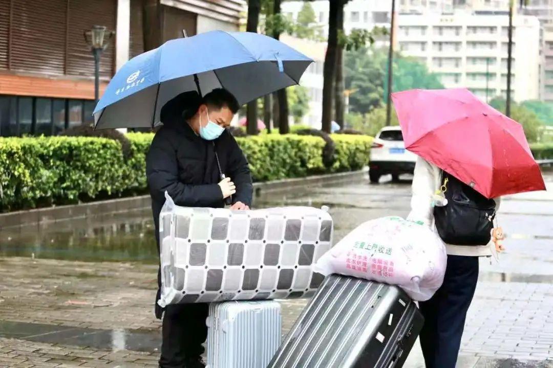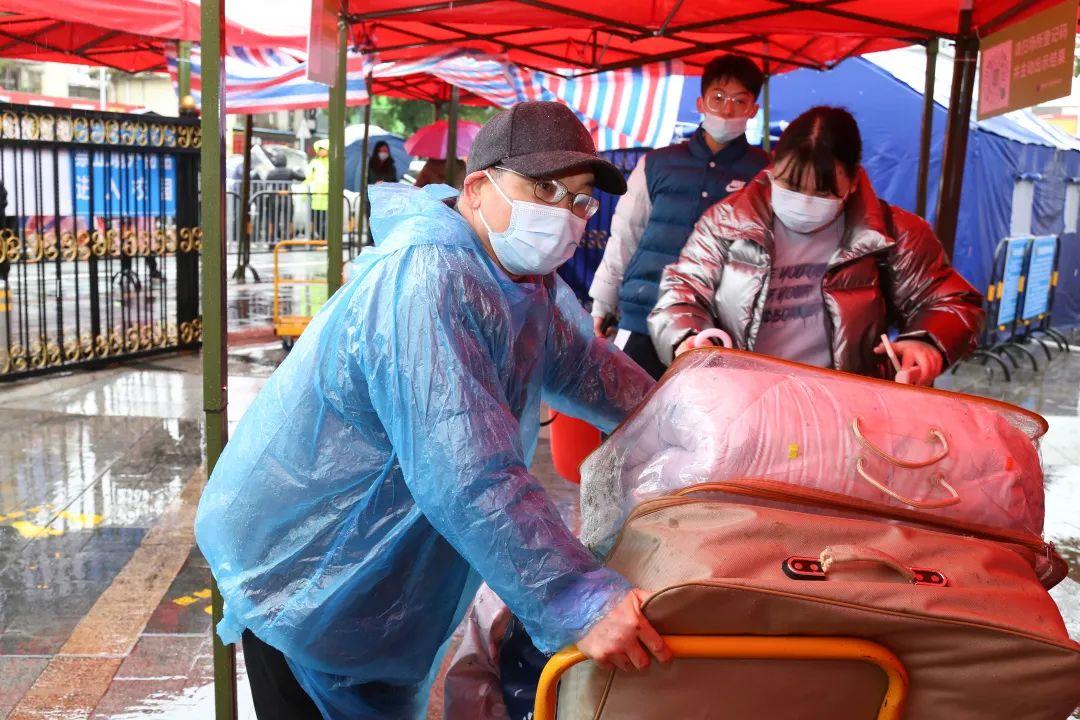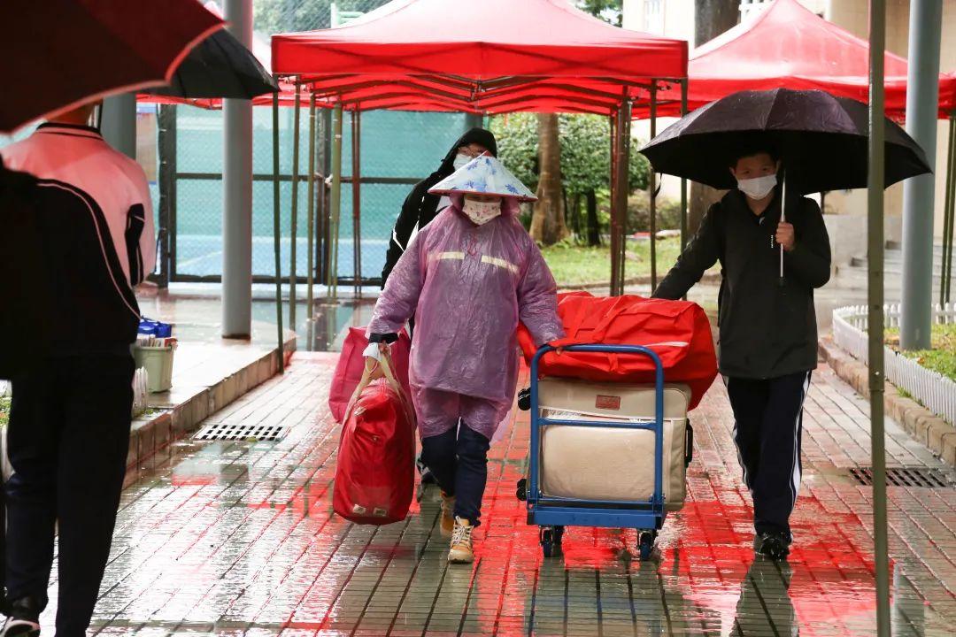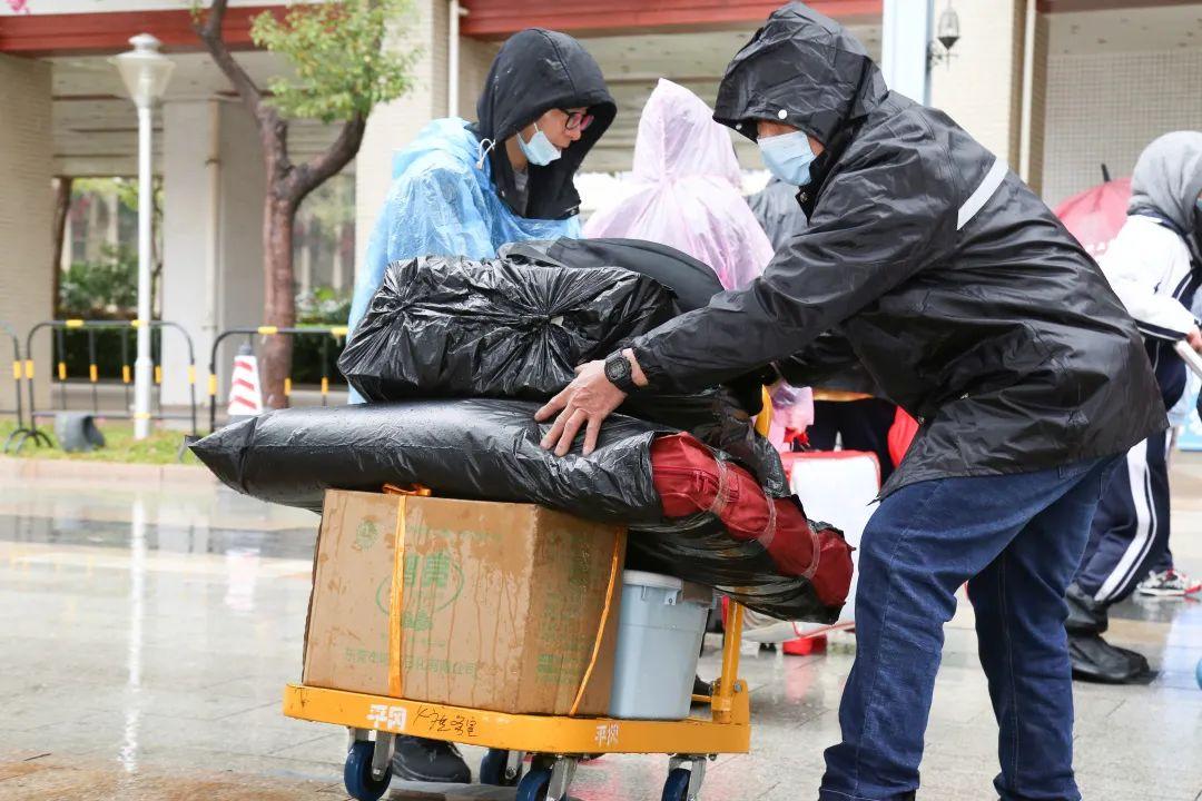 布吉高级中学校园防疫安全领导小组提前统一部署高三年级返校。因冷雨天气,学校在门口为学生搭起了“蓝色长廊”。在核查完符合返校要求的学生的24小时核酸、绿码、测量体温后,老师们与学校保安队主动上前,帮学生们搬运大件行李物品。