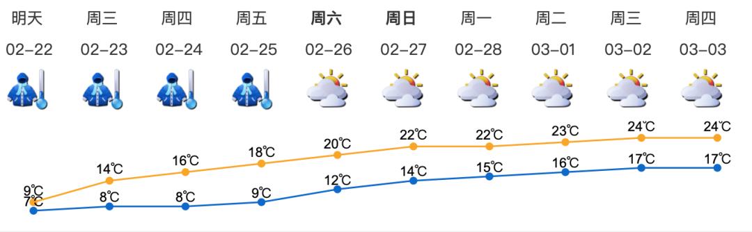 22日有中雨局部大雨,期间最低气温降至7℃左右,日温差小,体感非常寒冷;