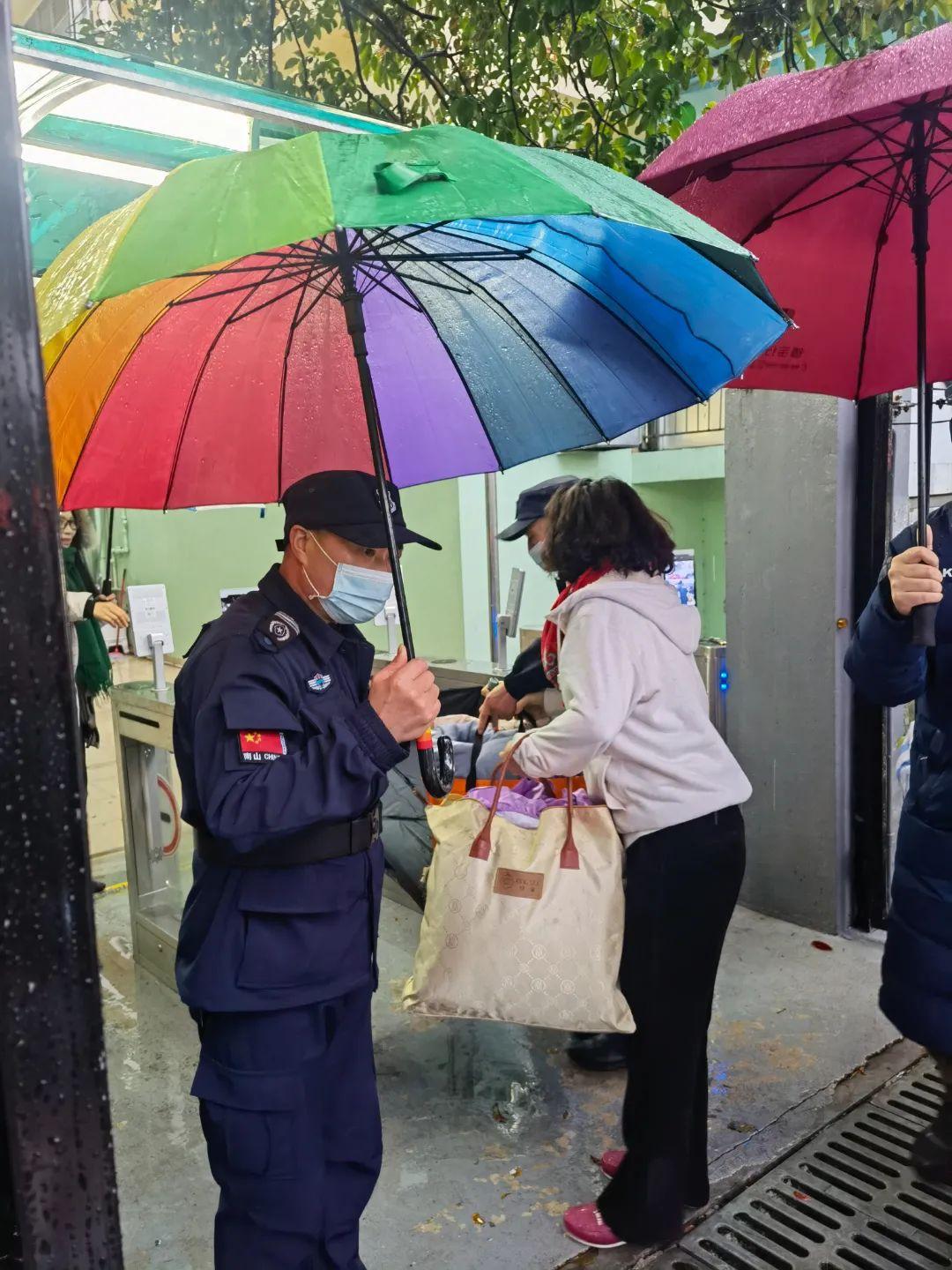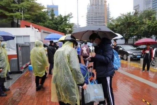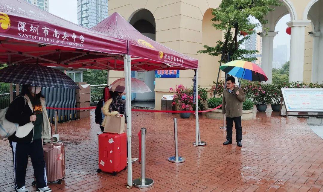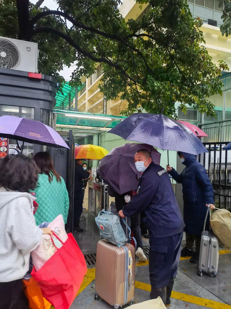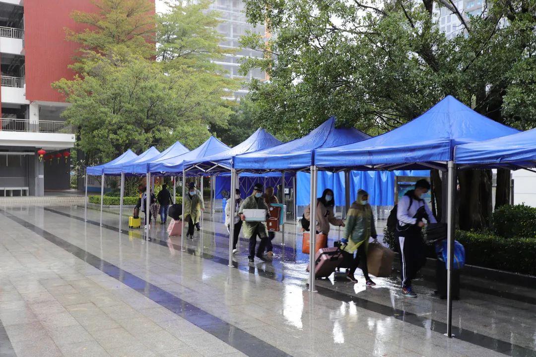 高中部和高三年级的干部、值班老师、学校后勤人员,冒雨在校门迎接返校的高三学生,并且认真查验24小时核酸码,帮助学生抬行李。风雨无情人有情,学校举动温暖着高三同学们的心。