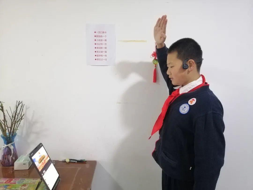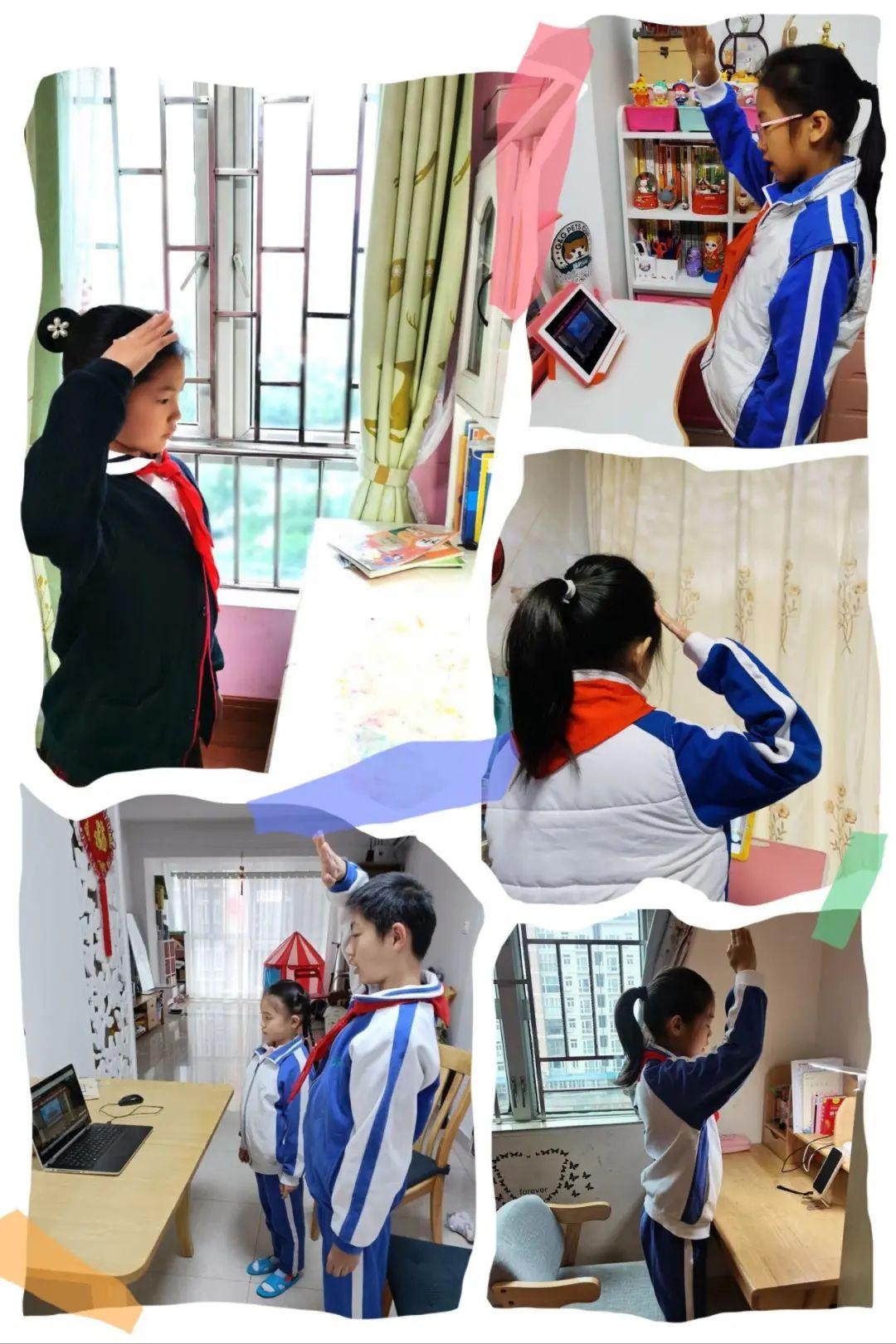 整个过程规范有序、环节齐全,确保与线下教育同效。同学们相约云端,一起唱国歌,一起立正敬礼。国歌响起,孩子们衣装整洁,佩戴红领巾,团员戴好团徽,站定肃立,目光坚定。