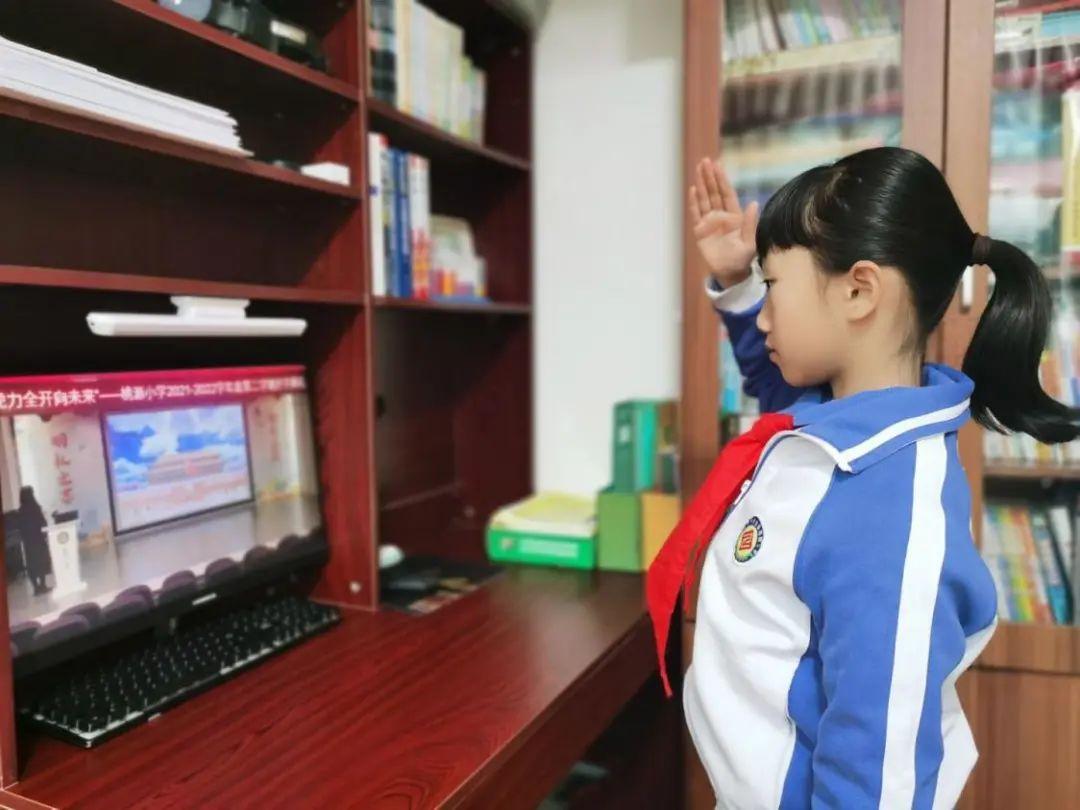 庄严的国歌声拉开了开学典礼的序幕,屏幕前的同学们起立向国旗敬礼,一张张稚嫩的脸上,是对祖国的崇敬,是对未来的坚定,他们在心中默默种下了约定——愿春暖花开,早日校园相聚!