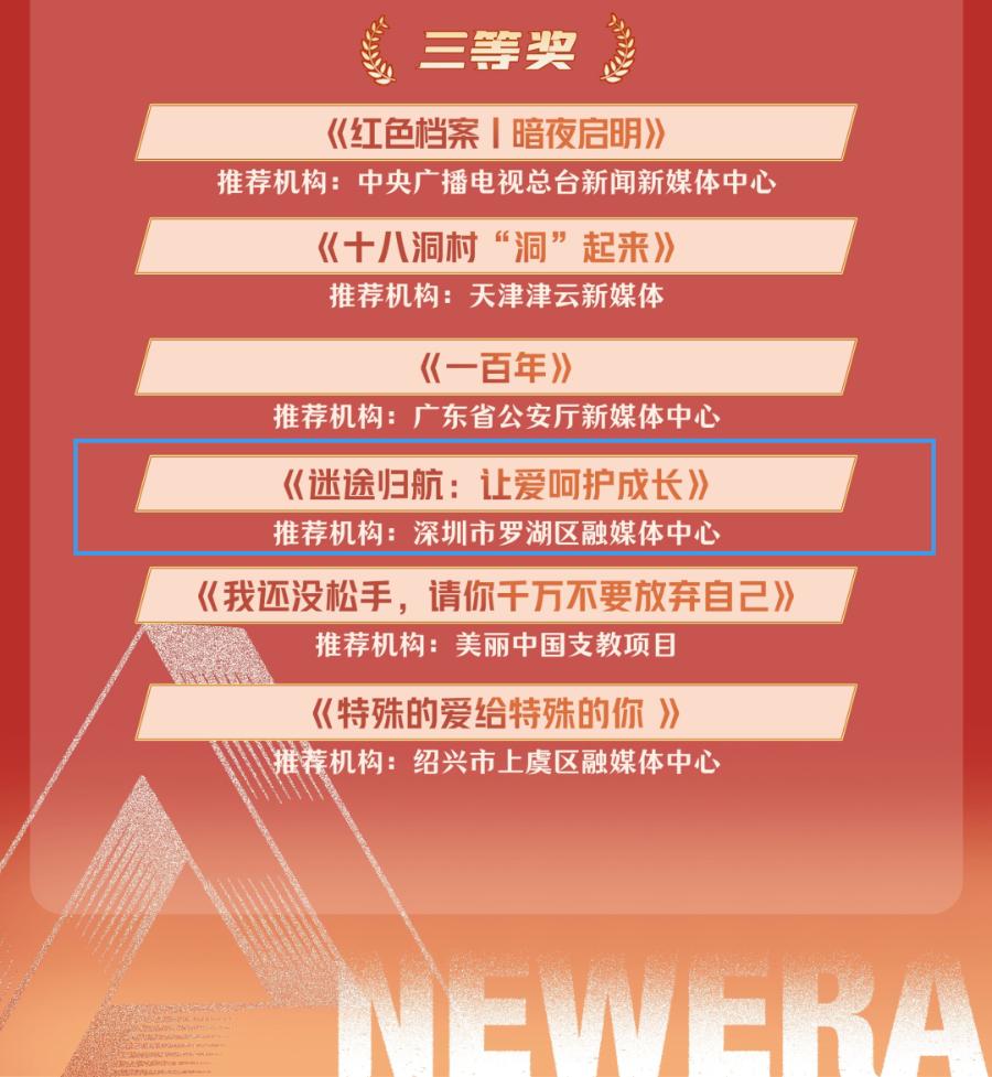 2月21日,由中共深圳市罗湖区委宣传部、深圳市罗湖区精神文明建设委员会办公室共同监制,罗湖区融媒体中心策划出品的《罗湖区未成年人思想道德建设》系列微电影短片——《迷途归航》,斩获第四届“你好,新时代—心中的旗帜”青年融媒体作品大赛的最佳导演奖三等奖 。