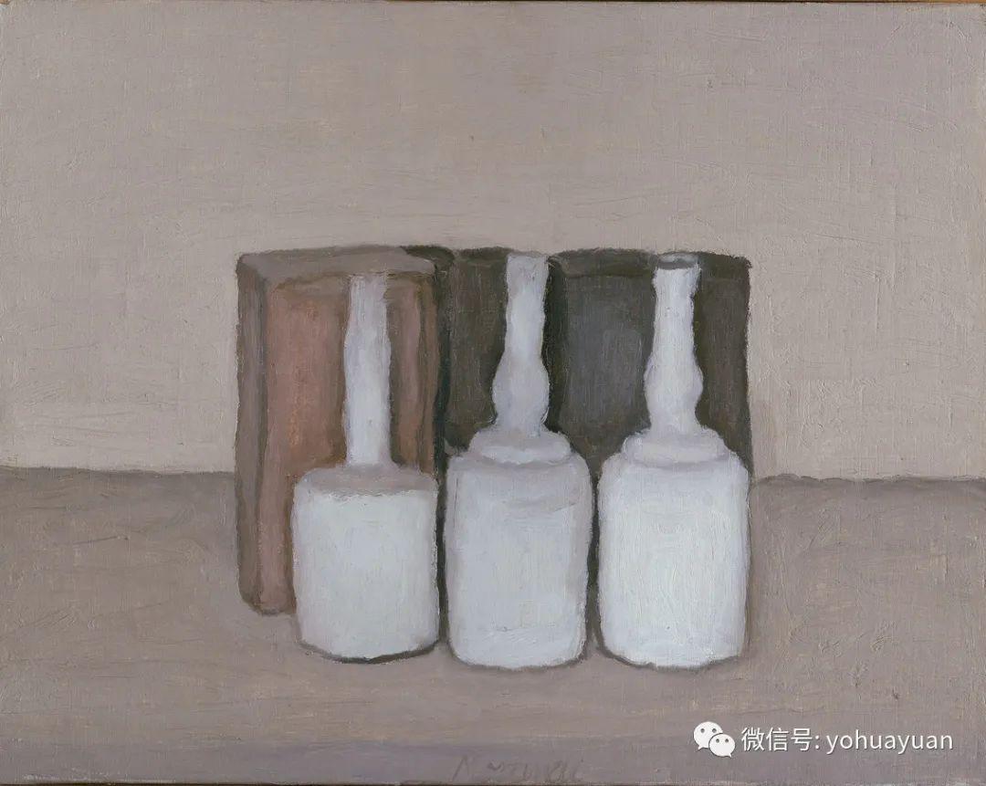 莫兰迪将瓶子作单纯化的处理,而后将其排列在一起,形成一个完善的整体,在细节和整体之间搭建桥梁。