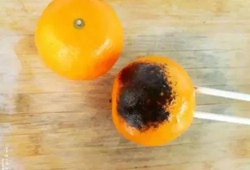 3.要来回地翻动,烤至橘皮刚刚变黑,就马上翻到另一面,直到整个橘子都烤黑。