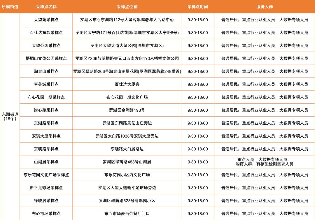 罗湖区设置了以下免费核酸采样点