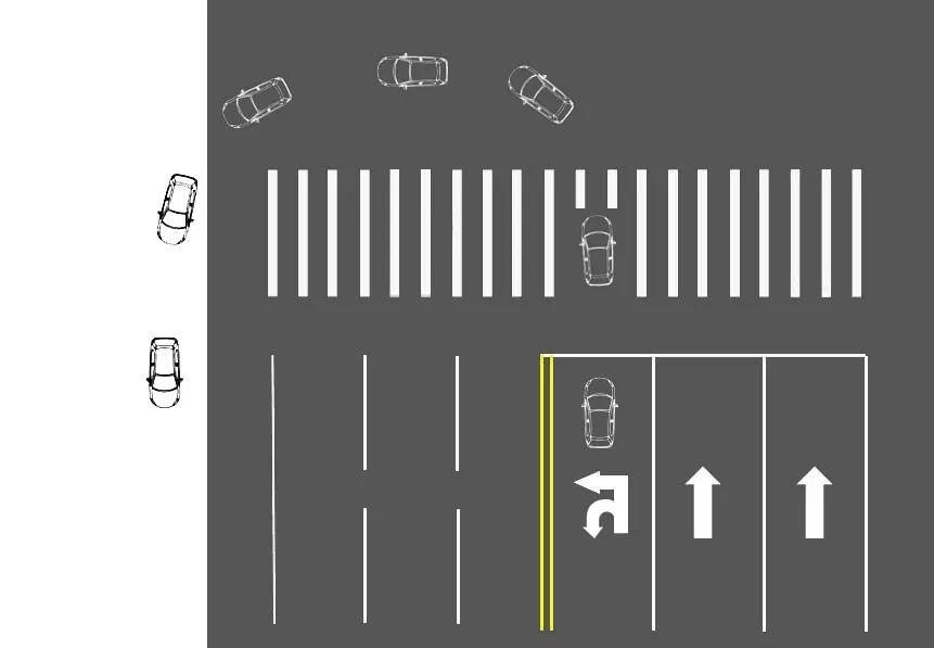 上游路口右转车辆在此路口需要左转,或者临近路口处有支路、匝道汇入主路的交通流以左转车辆为主时,若按照传统设置左转车道,会导致需要左转的车流横切多条车道,在路口处产生严重交织,从而引发交通拥堵甚至交通事故。