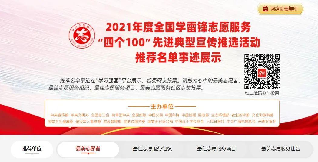 中央宣传部、中央文明办等部门和单位共同组织开展2021年度全国学雷锋志愿服务“四个100”先进典型宣传推选活动,宣传推选出100个最美志愿者、100个最佳志愿服务组织、100个最佳志愿服务项目和100个最美志愿服务社区。