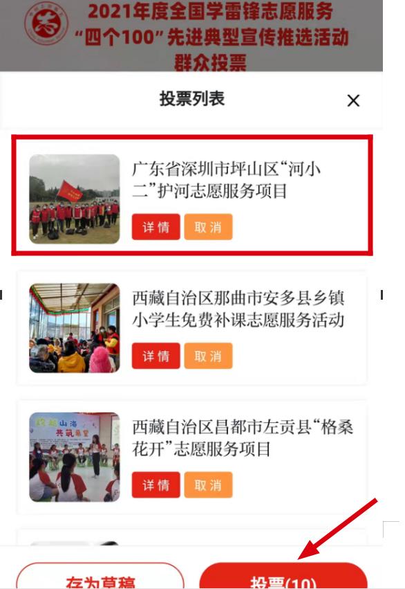3.在左侧“地区选择”中找到“广东”并找到您要投票的对象,点击“加入”选择再点击“投票”即可。