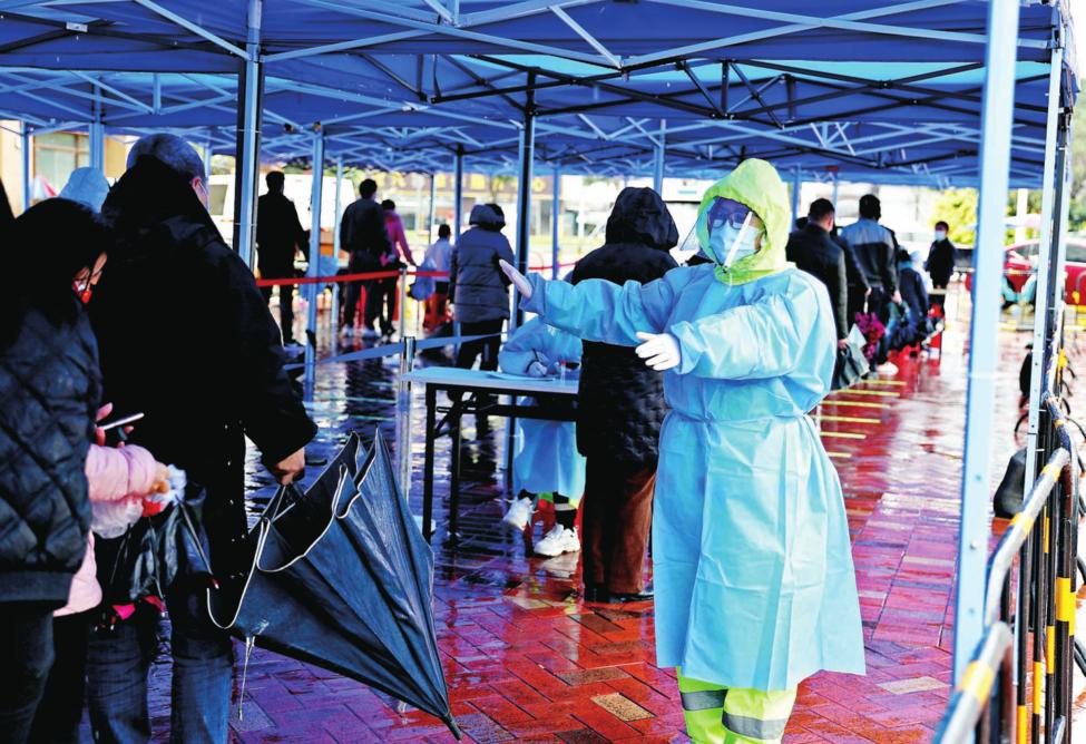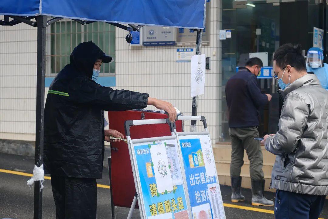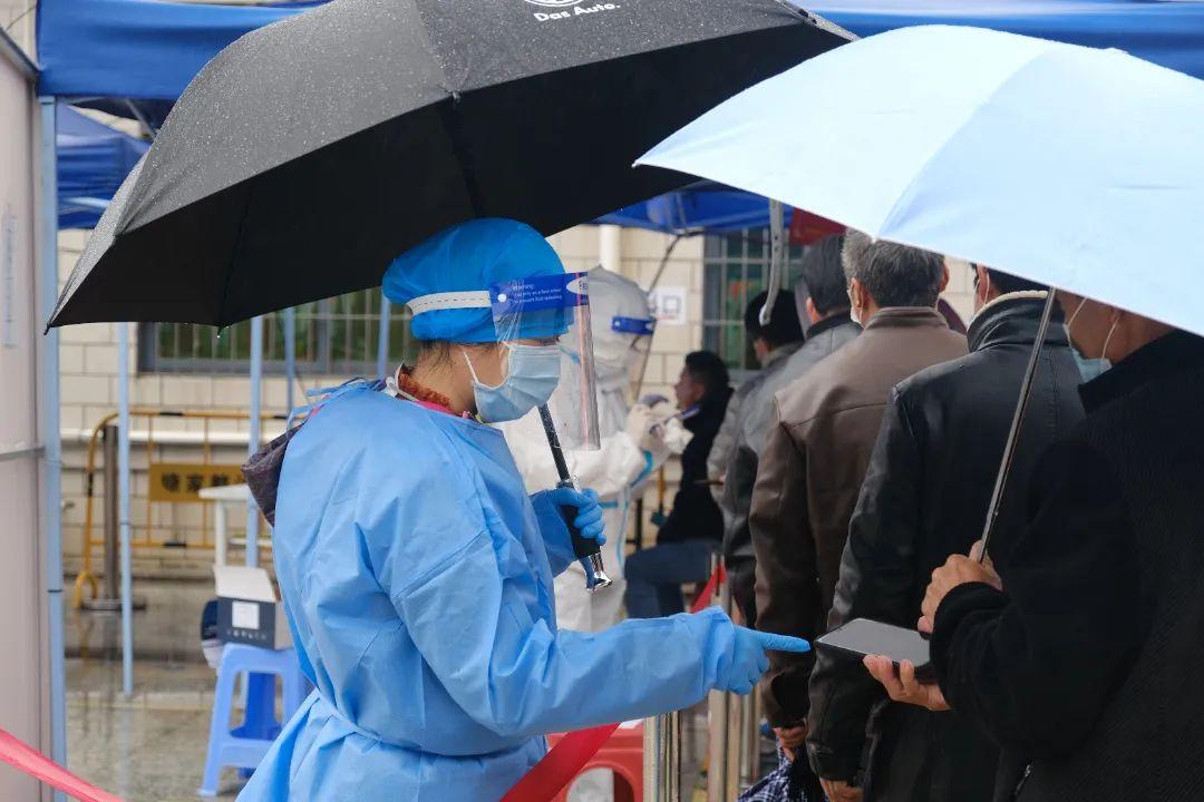 尽管天气寒冷又下雨,社区工作人员和医护仍坚守防疫一线进行核酸采样工作。