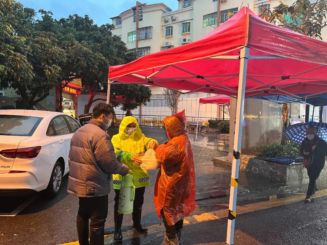 现场的工作人员说道“最近天气特别差,阴雨连绵,虽然我们身上是凉的,手脚是冰凉的,手伸都伸不直,但是社区对我们的工作是大力支持的,昨天晚上还有居民为夜间工作的防疫人员送来了热乎乎的奶茶,所以我们心里是暖暖的。”
