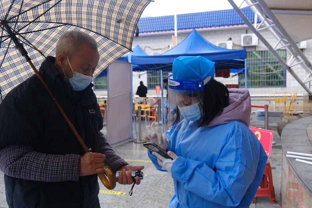 雨中,防疫工作人员撑着伞引导居民出示核酸码。