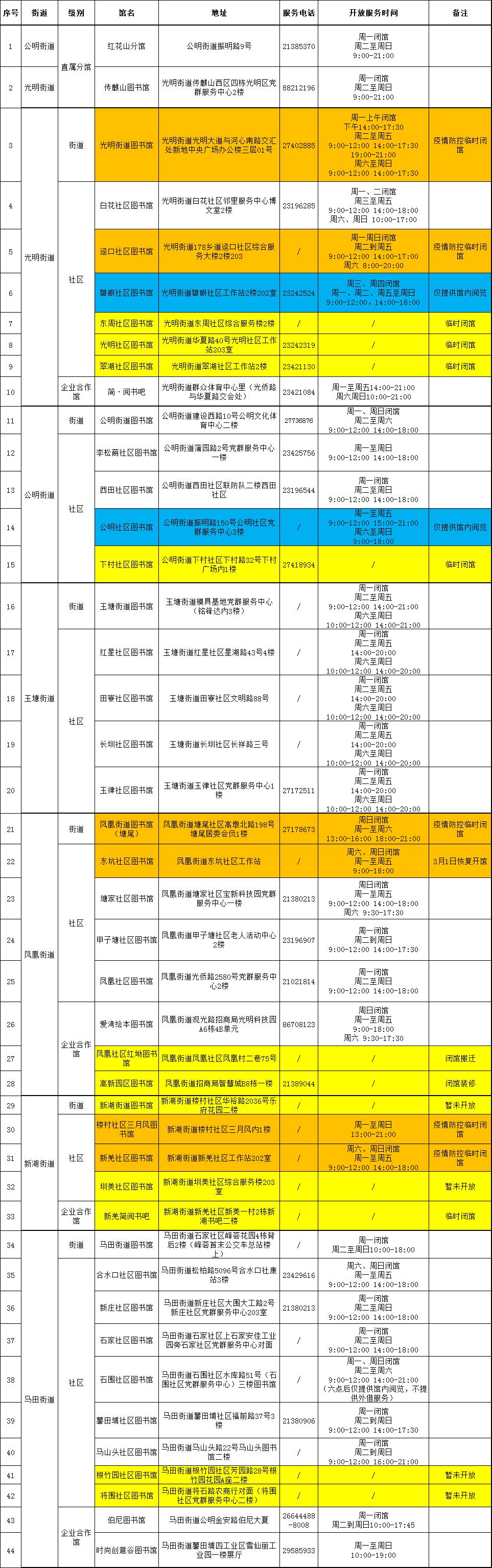 光明区图书馆凤凰街道甲子塘社区图书馆、塘家社区图书馆、凤凰社区图书馆于2月22日(周二)起恢复开放及服务,东坑社区图书馆于3月1日(周二)起恢复开放及服务。凤凰街道图书馆(塘尾)被征用作核酸检测点将继续闭馆,具体开放时间另行通知。