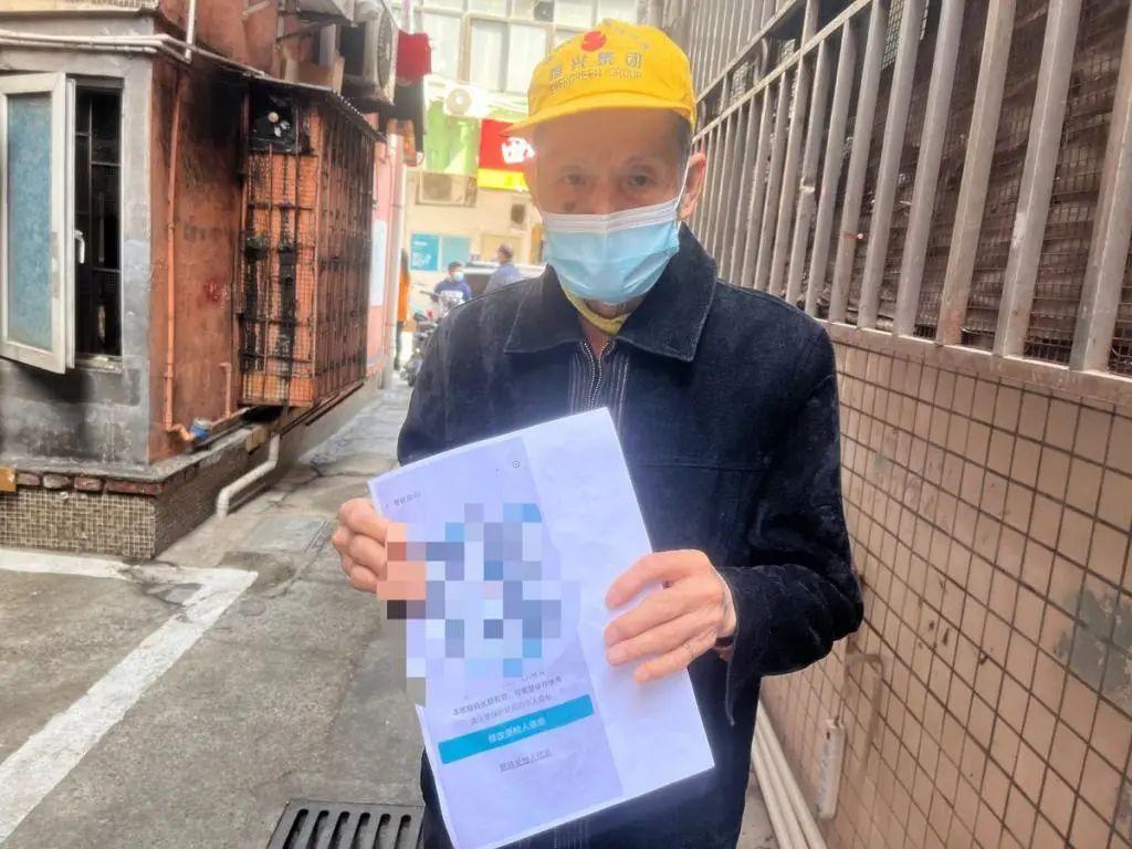 面对两位听力都不太好的长者,防疫人员只能大声且多次地询问情况,随后用自己的手机为他们申请了粤核酸检测码,并联系管控区外的工作人员打印出来送给长者。
