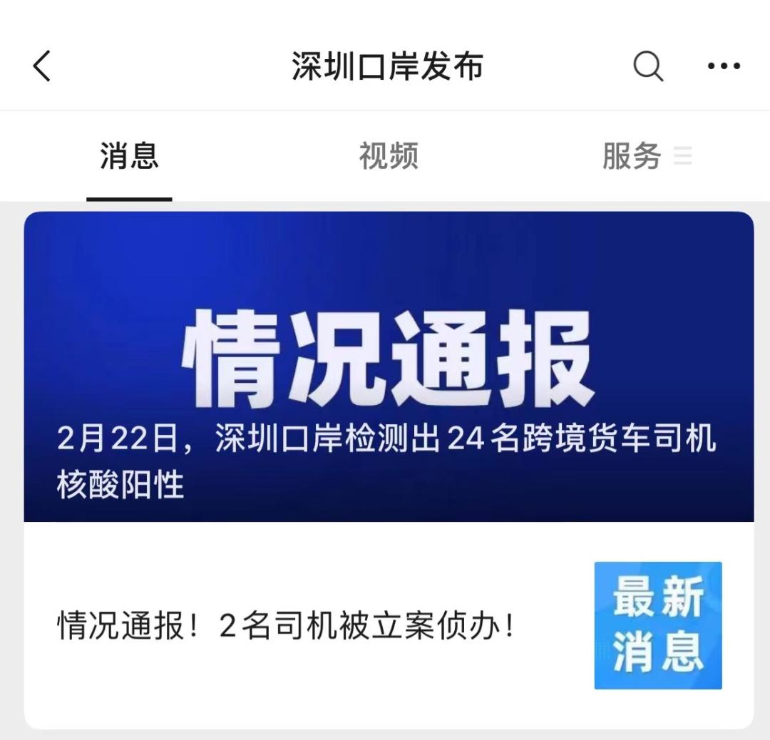 2月22日,深圳口岸检测出24名跨境货车司机核酸检测阳性。该24名患者为2月4日以来,深圳口岸检出的第106名至第129名跨境司机阳性病例。