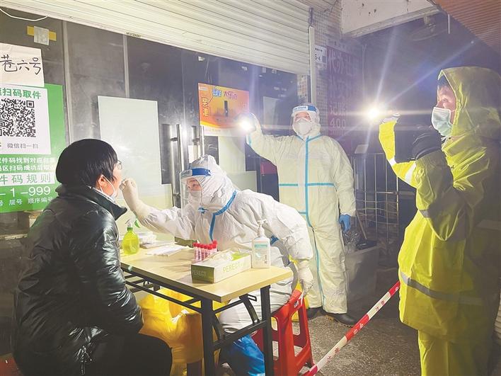 雨夜里,临时采样点搭建起一张张小桌,灯光下,穿着白色防护服的医护人员们忙碌不停。“扫码登记好,保持一米线的距离等候采样”,“请坐下,张开嘴巴”,医护人员手臂不断抬起又放下,一边指导受检居民,一边娴熟地采样。简单交流,默契配合,医护人员与居民之间已然架起一座座信任的桥梁。