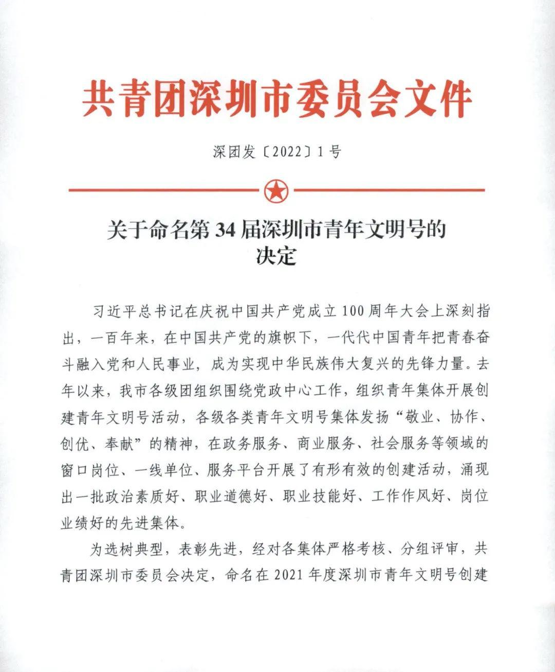 荣获“深圳市青年文明号”称号