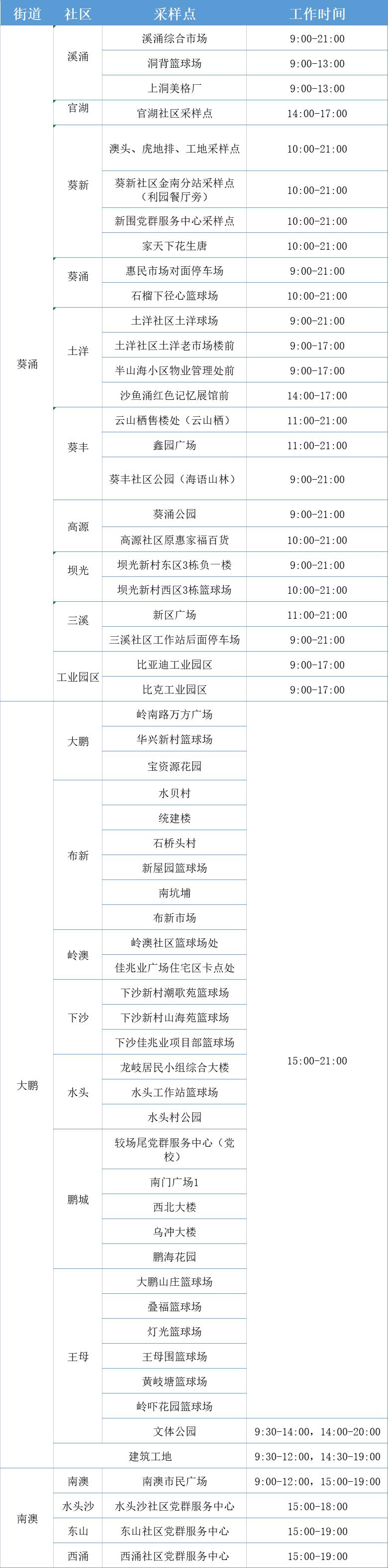 大鹏新区免费核酸检测点一览表