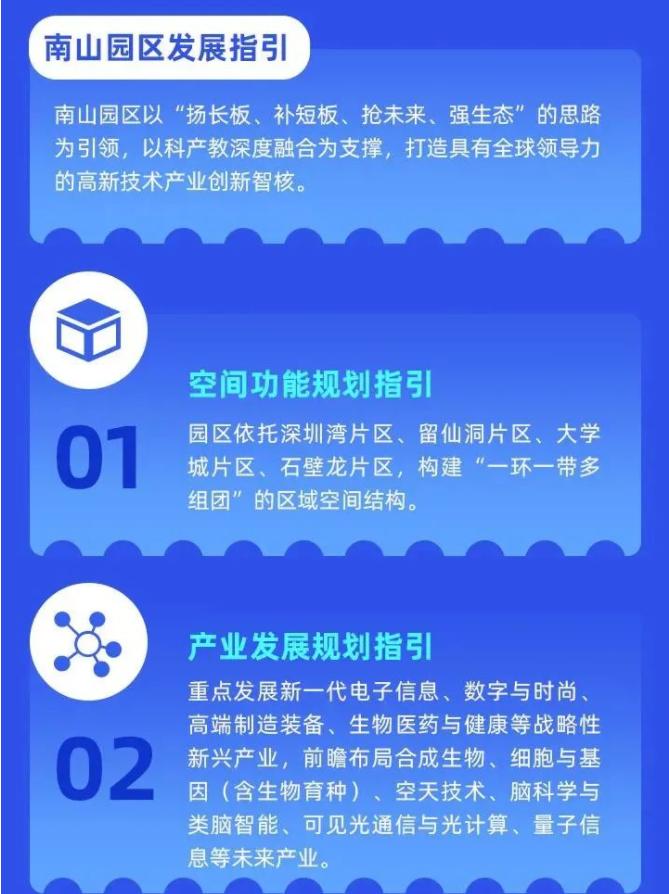 1、重点打造新一代电子信息全球顶尖产业,着力发展网络与通信、半导体与集成电路、超高清视频显示、智能终端、智能传感器产业集群,重点布局南山园区、坪山园区、龙岗园区、宝安园区、龙华园区。