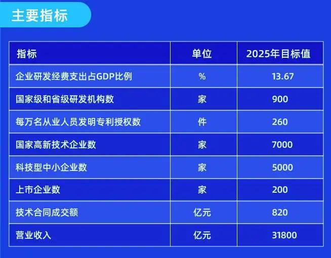 《规划》设置了2025年的主要目标值,包括企业研发经费支出占GDP比例为13.67%,国家级和省级研发机构数为900家,每万名从业人员发明专利授权数为260件,国家高新技术企业为7000家,科技型中小企业数为5000家,上市企业数为200家,技术合同成交额820亿元,营业收入31800亿元。
