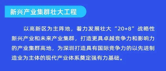 “新兴产业集群壮大工程”提出以高新区为主阵地,着力发展壮大“20+8”战略性新兴产业和未来产业集群,打造更具卓越竞争力和影响力的产业集群高地,为深圳打造具有国际竞争力的,以先进制造业为主体的现代产业体系奠定强有力基础。