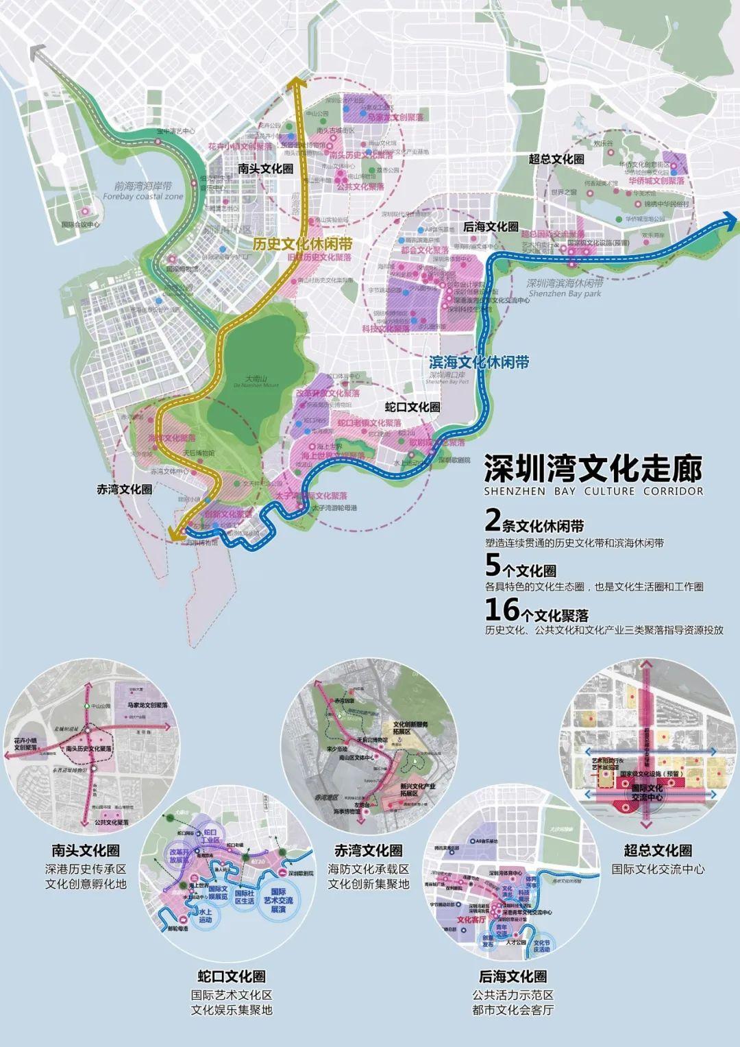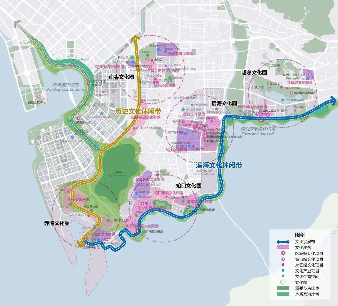 两条文化休闲带上镶嵌南头文化圈、赤湾文化圈、蛇口文化圈、后海文化圈、超总文化圈五大特色文化圈,风格鲜明,各美其美。