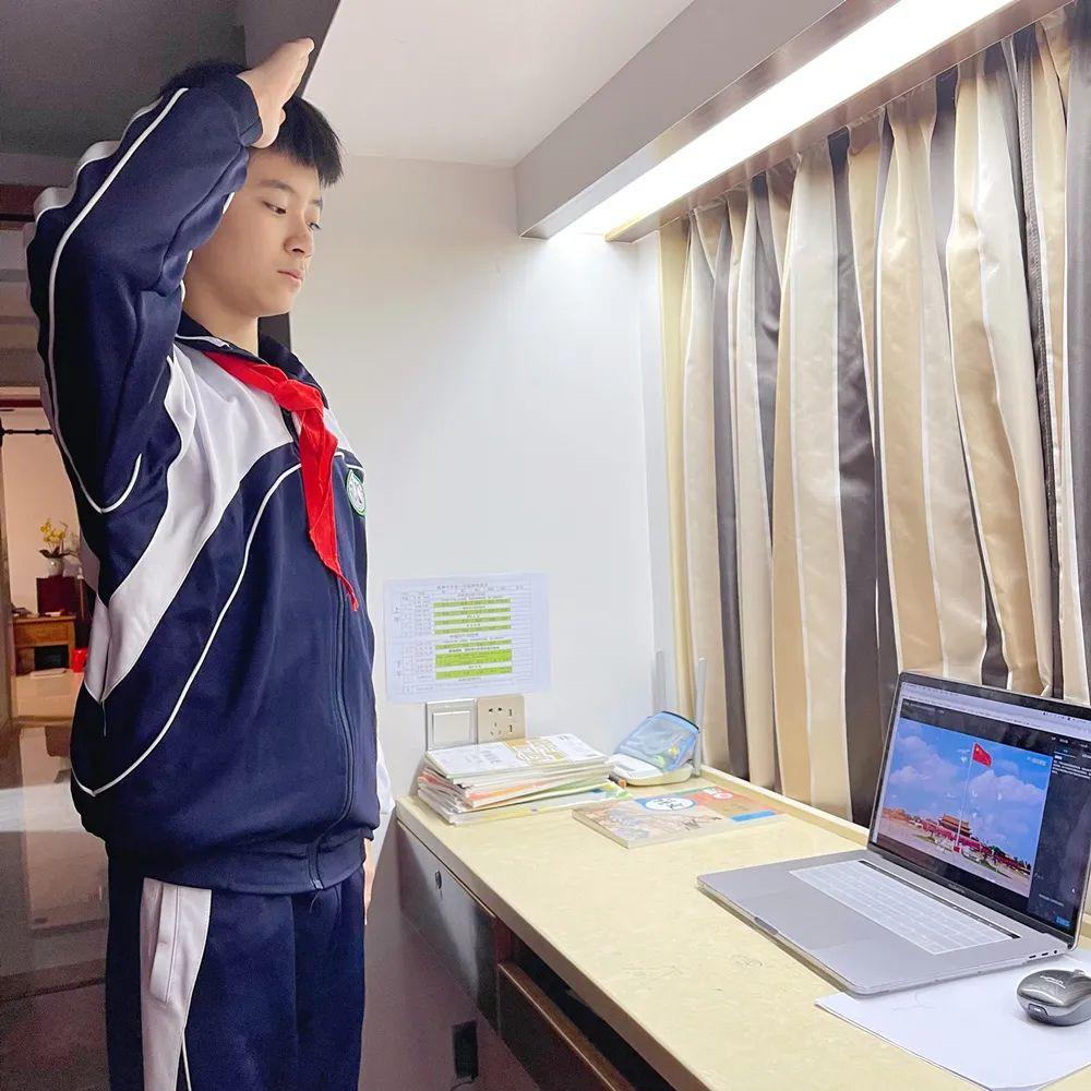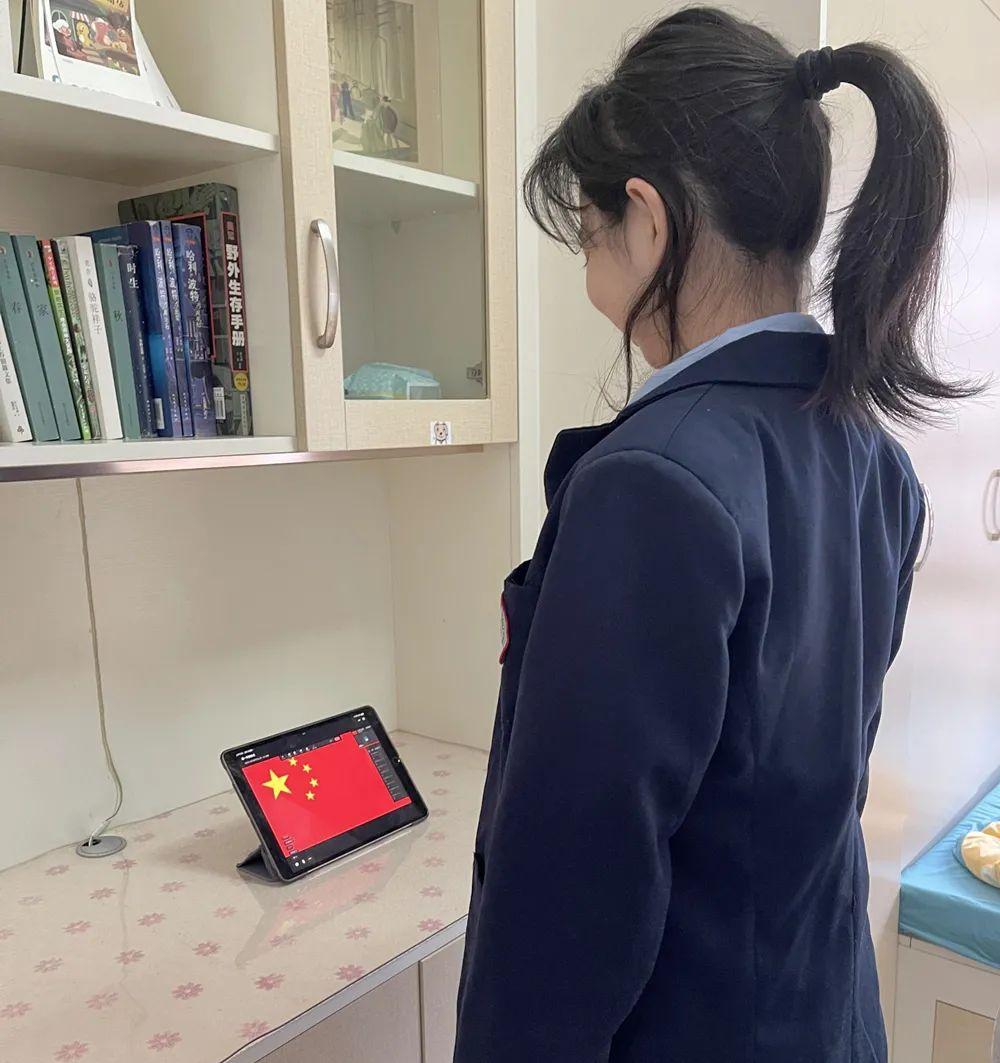 在开学典礼上,同学们面对屏幕自觉肃立,向国旗敬礼,以这种特殊的方式开启新学期。