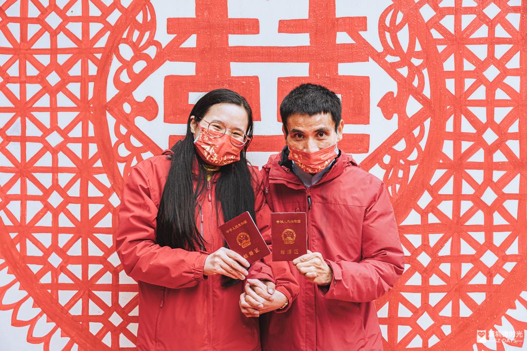 红衣服、红口罩、红本子、红双喜,来自江西的钟老师与妻子戴着口罩也挡不住他们脸上的幸福