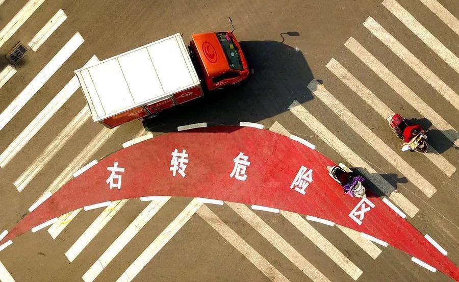 为进一步避免右转盲区事故发生,所有大型车辆在路口右转或行经右转渠化匝道时,需做到“右转停让”,严格按照“一停、二看、三起步、四慢行通过”四个步骤进行右转弯。