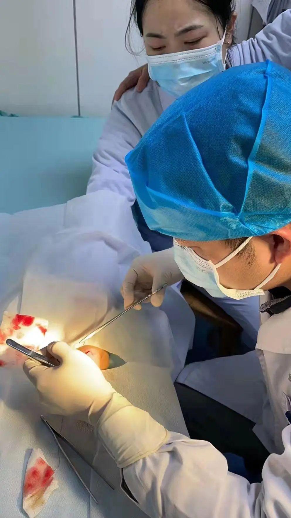 她的食指第一关节处缝了三针,指关节被纱布和压舌板固定起来,用纱布紧紧包裹。何雨遐打麻药时满眼含泪的照片就在那时被同事拍下来。