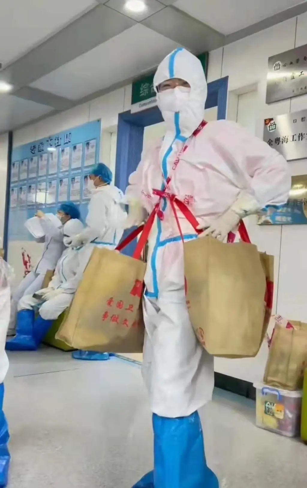 2 月 20 日、21 日连续下着雨刮着风,医生护士们穿着防护服,把鞋套换成了防雨的塑料鞋套,唯一的缺点就是行走很不方便,比较容易滑倒。为了方便工作,他们甚至用警示带加长了手提袋,做成斜跨包,用来装隔离衣、消毒液、采样试管等,调侃其为 " 最新潮的 LV"。